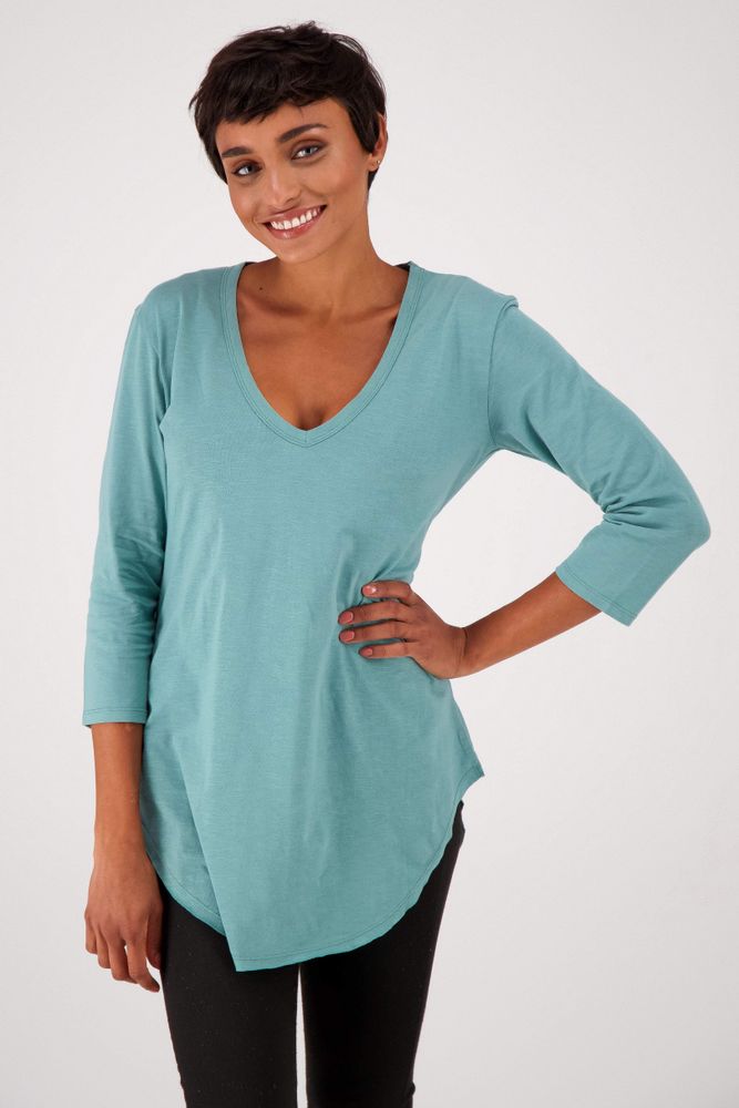 This perfectly flattering V-neck is made of super soft 100% organic slub jersey. Why organic? Our cotton is organically farmed and free from toxic chemicals and genetically modified seeds to benefit the soil, cotton, farmers and you. It also ensures that the long fibres are not damaged, leading to smoother yarn and softer fabric. This ¾ sleeve tee features a trendy curved unfinished shirttail hem and a relaxed fit for casual comfort. A year-round closet essential perfect for layering.