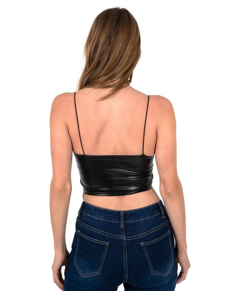 Introducing our stunning Florian Vegan Leather Bralette, the perfect addition to your wardrobe! Made with a high-quality PU faux leather black fabric, this bralette is both stylish and cruelty-free. The low scoop neckline and crop design create a flattering silhouette, while the spaghetti straps add a touch of elegance.