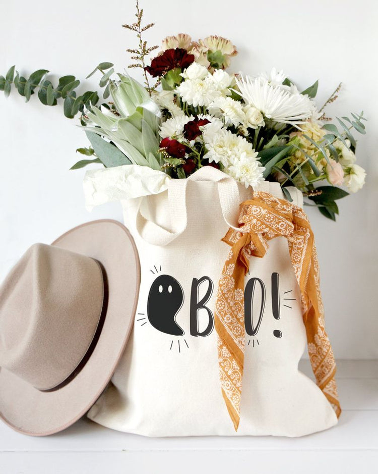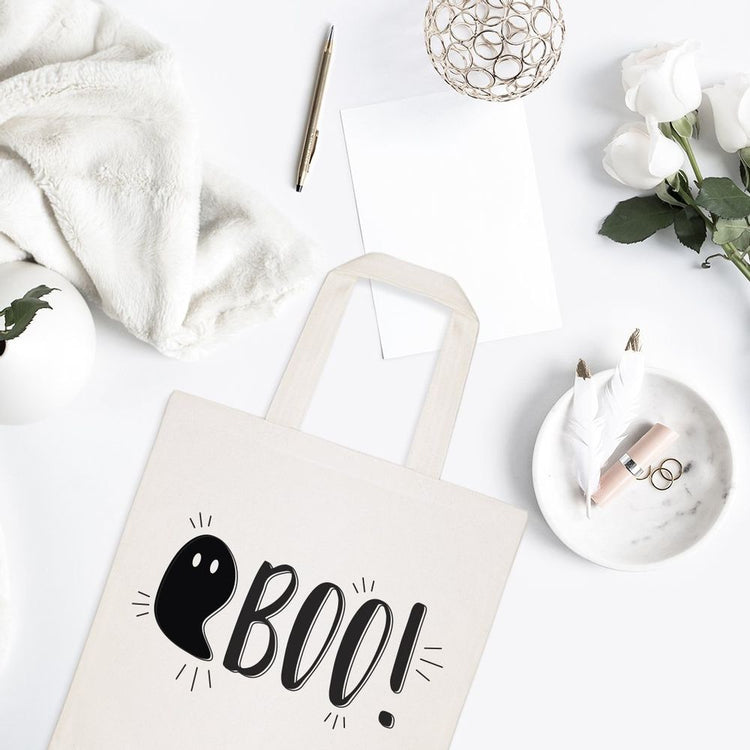 Not only is this tote bag eco-friendly, but it's also stylish and unique with its simple yet eye-catching design. The "Boo!" print will make a statement and get you in the Halloween spirit. And with its reusable nature, you can use this bag year after year, making it a sustainable choice for your shopping needs.