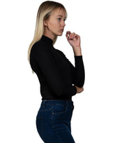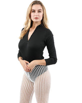 A perfect addition to your wardrobe with our Beverly Zip-Up Ribbed Bodysuit in black. Featuring a fitted semi-stretch ribbed fabric, low mock neckline, long sleeves, and hidden zipper closure.