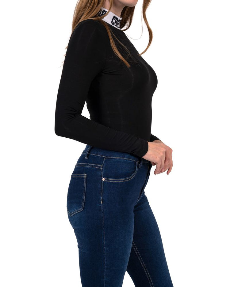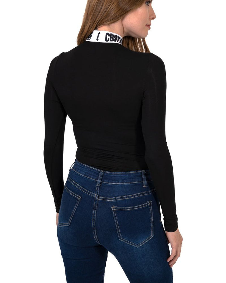 Our Marilyn Long Sleeve Bodysuit is the perfect addition to your wardrobe. Featuring a tight-fitting black fabric, a turtleneck in white with font, and long sleeves, this bodysuit is sure to make a statement. Crafted from 100% Polyester, this bodysuit is machine washable and imported.